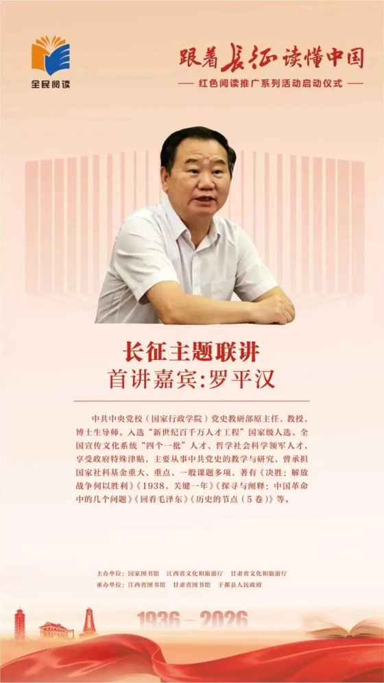 以书为舟,追寻长征足迹;以读为桥,读懂伟大中国。由国家图书馆、江西省文化和旅游厅、甘肃省文化和旅游厅联合主办的 "跟着长征读懂中国"红色阅读推广系列活动启动仪式将在中央红军长征集结出发地于都举行 。