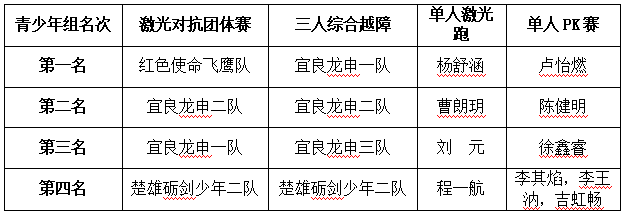 刘启勇获得社会组单人激光跑冠军,王艺橙获得青少组单人激光跑冠军,黄业鹏获得社会组单人PK赛冠军,卢怡燃获得青少组单人PK赛冠军。