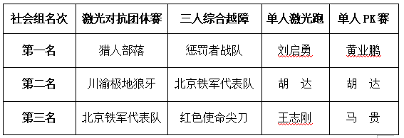 猎人部落获得社会组5人激光团体对抗赛冠军,川渝极地狼牙获得亚军,北京铁军代表队获得季军。