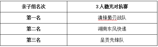 滇锋蜀刃战队获得亲子组3人激光对抗赛冠军,湖南东风快递队获得3人激光对抗赛亚军,呈贡先锋队获得亲子组3人激光对抗赛季军。