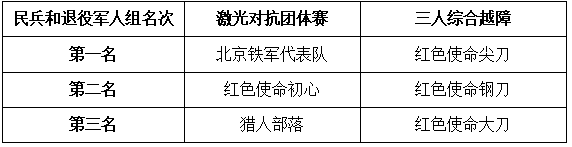 红色使命尖刀队获得民兵和退役军人组三人综合越障和五人抗眩晕接力跑两项冠军,北京铁军代表队吴辰同志获得民兵和退役军人组单人滚轮胎冠军。