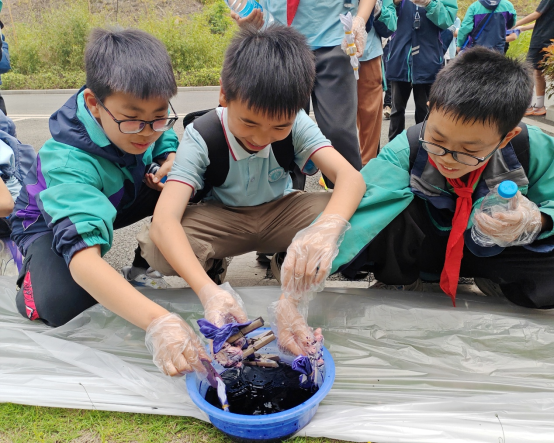 与科技课程的未来感形成鲜明对比的,是非遗扎染的静谧氛围。在扎染课程中,学生们亲手将白布捆扎、浸染,观察靛蓝染料在布面上晕染出的独一无二的纹样。在指导老师解释扎染背后的科学原理后,五年级一班的彭诗琪捧着自己创作的扎染方巾说:“这真是太神奇了!当我真正看到这些普通的布料在自己的手中变成独一无二的作品时,那种成就感无法用言语来形容。”她小心翼翼地展开方巾,上面的图案就如同一幅抽象的山水画,深浅不一的蓝色相互交融。“我觉得这不仅仅是一门手艺,更是一种文化的传承。我们要用双手去感受古老技艺的魅力,同时也把这份美好传递下去。”
