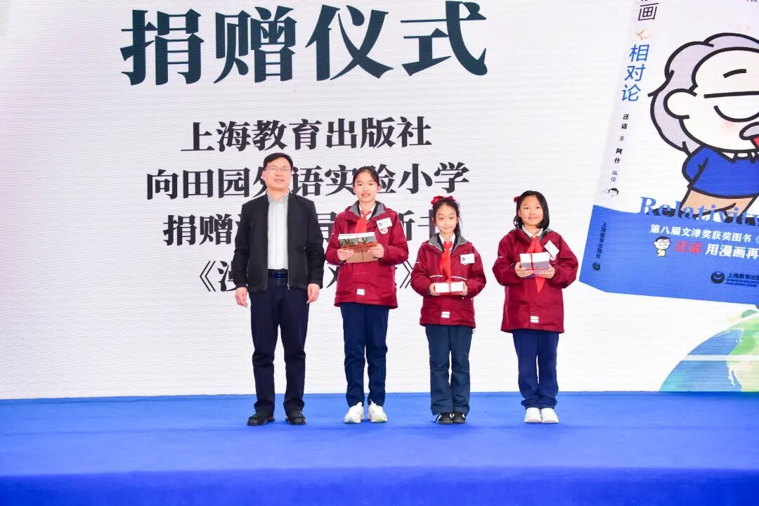 此外,活动现场还举行了温馨的图书捐赠仪式。上海教育出版社向田园外语实验小学捐赠了汪诘导演创作的《漫画相对论》。在这本书中,汪诘用画笔与文字为孩子们搭建了一座通向科学星空的桥梁。该书将纳入田园外小思政教育资源库,助力学校“大思政课”内容形式创新。