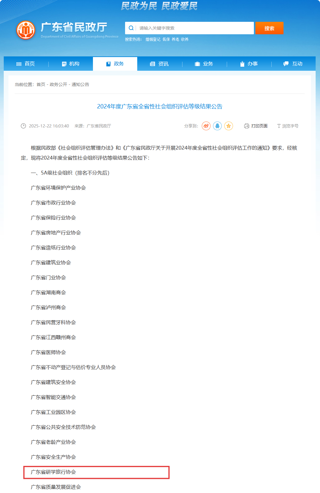 广东省民政厅2024年度广东省全省性社会组织评估等级结果公告