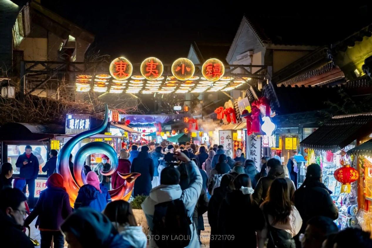 元旦期间,夜晚的东夷小镇人声鼎沸,贺年会等活动吸引市民游客。刘晶 摄
