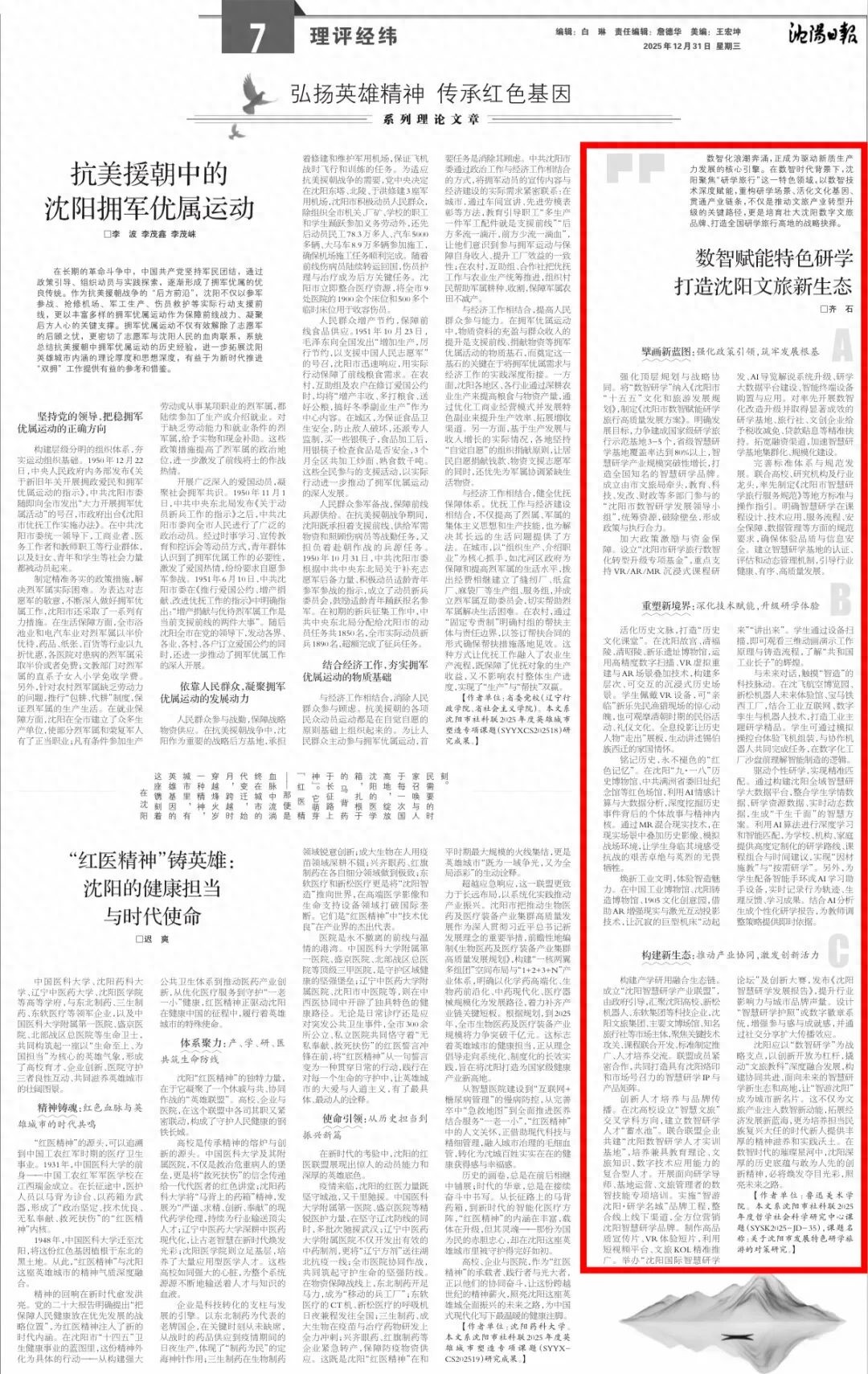 齐石数智化浪潮奔涌,正成为驱动新质生产力发展的核心引擎。在数智时代背景下,沈阳聚焦“研学旅行”这一特色领域,以数智技术深度赋能,重构研学场景、活化文化基因、贯通产业链条,不仅是推动文旅产业转型升级的关键路径,更是培育壮大沈阳数字文旅品牌、打造全国研学旅行高地的战略抉择。擘画新蓝图:强化政策引领,筑牢发展根基强化顶层规划与战略协同。将“数智研学”纳入《沈阳市“十五五”文化和旅游发展规划》,制定《沈阳市数智赋能研学旅行高质量发展方案》。明确发展目标,力争建成国家级研学旅行示范基地3-5个,省级智慧研学基地覆盖率达到80%以上,智慧研学产业规模突破性增长,打造全国知名的智慧研学品牌。成立由市文旅局牵头,教育、科技、发改、财政等多部门参与的“沈阳市数智研学发展领导小组”,统筹资源,破除壁垒,形成政策与执行合力。加大政策激励与资金保障。设立“沈阳市研学旅行数智化转型升级专项基金”,重点支持VR/AR/MR沉浸式课程研发、AI导览解说系统升级、研学大数据平台建设、智能终端设备购置与应用。对率先开展数智化改造升级并取得显著成效的研学基地、旅行社、文创企业给予税收减免、贷款贴息等精准扶持。拓宽融资渠道,加速智慧研学基地集群化、规模化建设。完善标准体系与规范发展。联合高校、研究机构及行业龙头,率先制定《沈阳市智慧研学旅行服务规范》等地方标准与操作指引。明确智慧研学在课程设计、技术应用、服务流程、安全保障、数据管理等方面的规范要求,确保体验品质与信息安全。建立智慧研学基地的认证、评估和动态管理机制,引导行业健康、有序、高质量发展。重塑新境界:深化技术赋能,升级研学体验活化历史文脉,打造“历史文化课堂”。在沈阳故宫、清福陵、清昭陵、新乐遗址博物馆,运用高精度数字扫描、VR虚拟重建与AR场景叠加技术,构建多层次、可交互的沉浸式历史场景。学生佩戴VR设备,可“亲临”新乐先民渔猎现场的惊心动魄,也可观摩清朝时期的民俗活动、礼仪文化。全息投影让历史人物“走出”展板,生动讲述锡伯族西迁的家国情怀。铭记历史,永不褪色的“红色记忆”。在沈阳“九·一八”历史博物馆、中共满洲省委旧址纪念馆等红色场馆,利用AI情感计算与大数据分析,深度挖掘历史事件背后的个体故事与精神内核。通过MR混合现实技术,在现实场景中叠加历史影像、模拟战场环境,让学生身临其境感受抗战的艰苦卓绝与英烈的无畏牺牲。焕新工业文明,体验智造魅力。在中国工业博物馆、沈阳铸造博物馆、1905文化创意园,借助AR增强现实与激光互动投影技术,让沉寂的巨型机床“动起来”“讲出来”。学生通过设备扫描,即可观看三维动画演示工作原理与铸造流程,了解“共和国工业长子”的辉煌。与未来对话,触摸“智造”的科技脉动。在沈飞航空博览园、新松机器人未来体验馆、宝马铁西工厂,结合工业互联网、数字孪生与机器人技术,打造工业主题研学精品。学生可通过模拟操控台体验飞机组装,与协作机器人共同完成任务,在数字化工厂沙盘前理解智能制造的逻辑。驱动个性研学,实现精准匹配。通过构建沈阳全域智慧研学大数据平台,整合学生学情数据、研学资源数据、实时动态数据,生成“千生千面”的智慧方案。利用AI算法进行深度学习和智能匹配,为学校、机构、家庭提供高度定制化的研学路线、课程组合与时间建议,实现“因材施教”与“按需研学”。另外,为学生配备智能手环或AI学习助手设备,实时记录行为轨迹、生理反馈、学习成果。结合AI分析生成个性化研学报告,为教师调整策略提供即时依据。构建新生态:推动产业协同,激发创新活力构建产学研用融合生态链。成立“沈阳智慧研学产业联盟”,由政府引导,汇聚沈阳高校、新松机器人、东软集团等科技企业,沈阳文旅集团、主要文博场馆、知名旅行社等市场主体,聚焦关键技术攻关、课程联合开发、标准制定推广、人才培养交流。联盟成员紧密合作,共同打造具有沈阳烙印和市场号召力的智慧研学IP与产品矩阵。创新人才培养与品牌传播。在沈高校设立“智慧文旅”交叉学科方向,建立数智研学人才“蓄水池”。联合联盟企业共建“沈阳数智研学人才实训基地”,培养兼具教育理论、文旅知识、数字技术应用能力的复合型人才。开展面向研学导师、基地运营、文旅管理者的数智技能专项培训。实施“智游沈阳·研学名城”品牌工程,整合线上线下渠道,全方位营销沈阳智慧研学品牌。制作高品质宣传片、VR体验短片,利用短视频平台、文旅KOL精准推广。举办“沈阳国际智慧研学论坛”及创新大赛,发布《沈阳智慧研学发展报告》,提升行业影响力与城市品牌声量。设计“智慧研学护照”或数字徽章系统,增强参与感与成就感,并通过社交分享扩大传播效应。沈阳应以“数智研学”为战略支点,以创新开放为杠杆,撬动“文旅教科”深度融合发展,构建协同共进、面向未来的智慧研学新生态和高地,让“智游沈阳”成为城市新名片。这不仅为文旅产业注入数智新动能,拓展经济发展新蓝海,更为培养担当民族复兴大任的时代新人提供丰厚的精神滋养和实践沃土。在数智时代的璀璨星河中,沈阳深厚的历史底蕴与敢为人先的创新精神,必将焕发夺目光彩,照亮未来