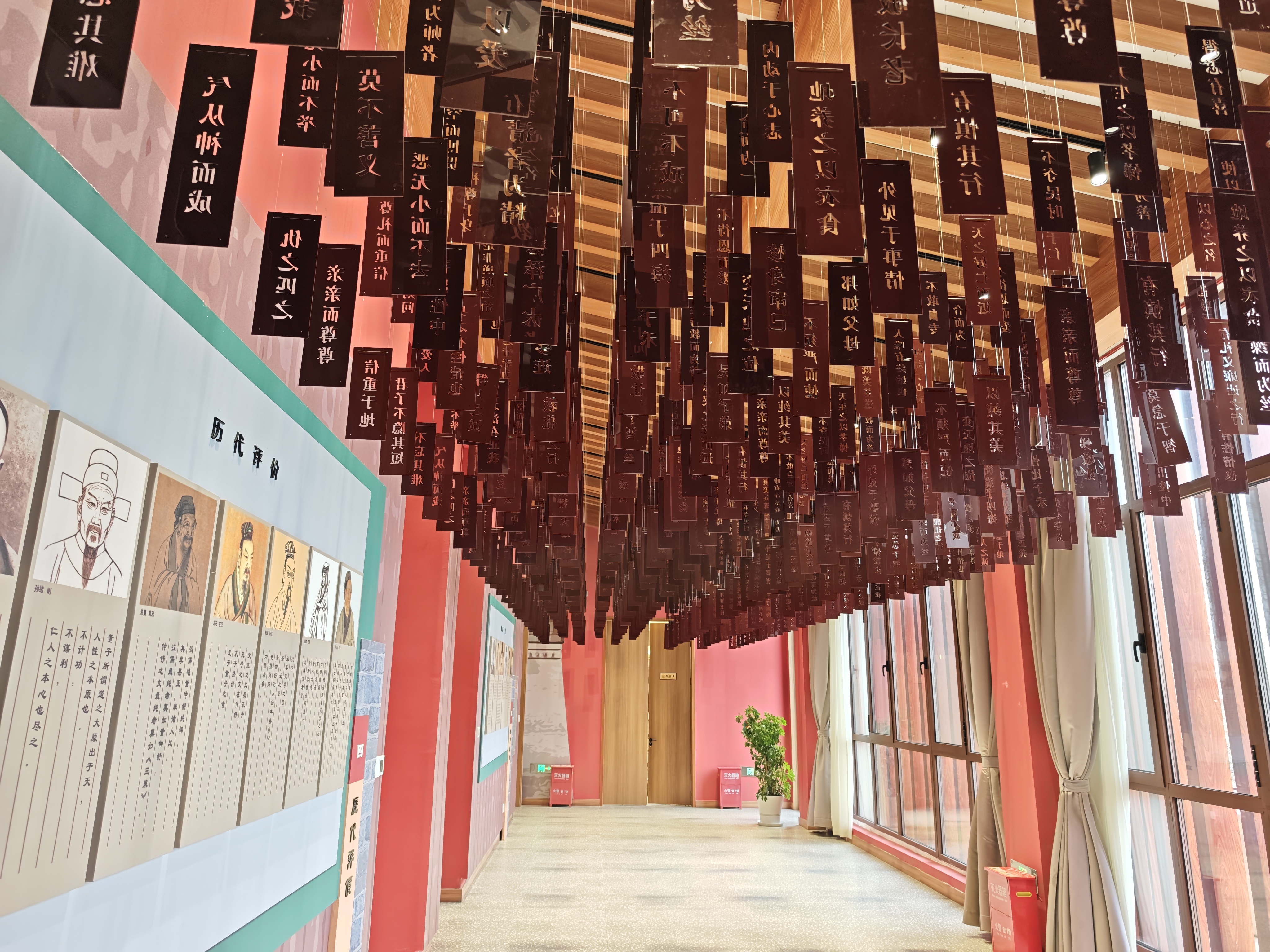 园区北侧,是董学园的核心建筑繁露学宫。繁露学宫包含四个展厅、一个多功能讲堂,其中,儒学发展史展区以董仲舒为轴心,勾勒出儒学的演进脉络;董仲舒思想主张展厅重点展示了董仲舒在儒学思想发展中的核心贡献;“董言董句”展厅别具一格,将董仲舒的经典名言悬于屋顶,成为独特的网红打卡地。