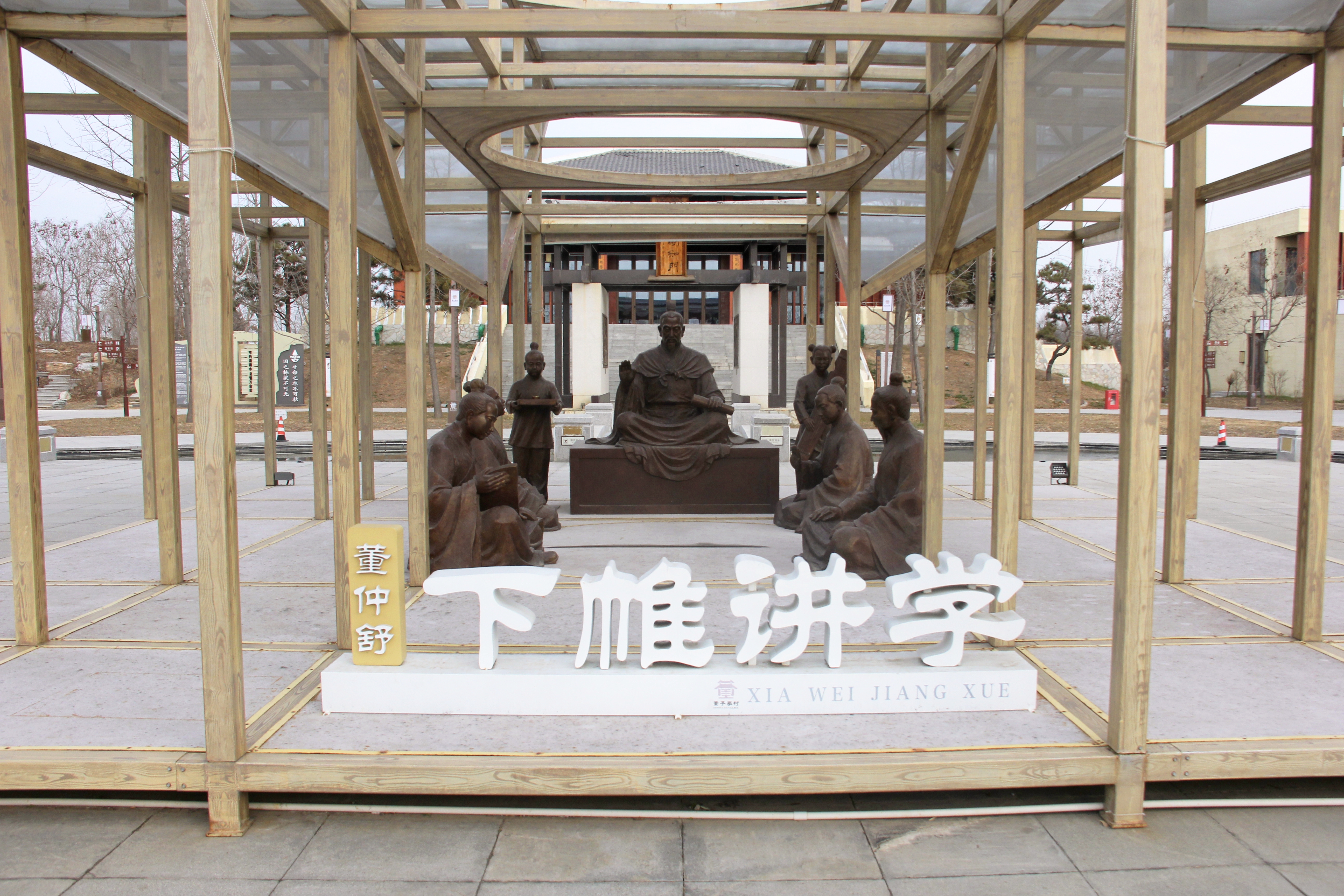 走出容服馆,便来到园区的正中心——下帷学坛。闫冰洁指向学坛中央的雕塑说:“史载,董仲舒曾在此‘下帷讲学’,眼前场景再现的正是董子‘下帷讲学’的情景。”