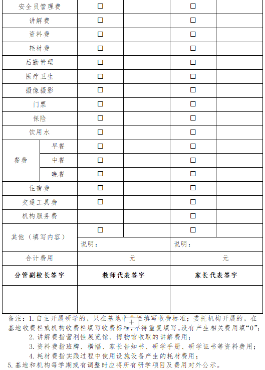 规范收费标准:学校在开展研学实践招标遴选前要做到严格核算相关费用,规范研学实践的收费范围,明确研学实践的收费项目明细,交通、门票、保险、餐饮、住宿、课程等费用不得超过市场价格,研学实践所涉及的吃、住、行、保险等各项收费不得超过相应同等规模旅游团队的价格。