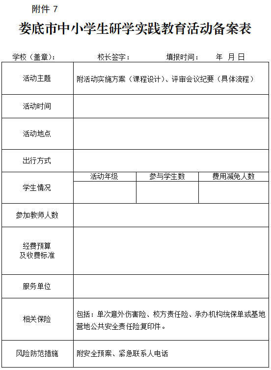 7.娄底市中小学生研学实践教育活动备案表